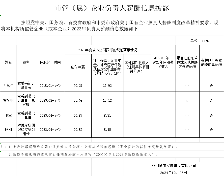 鄭州城市發(fā)展集團有限公司2023年企業(yè)負責(zé)人薪酬情況
