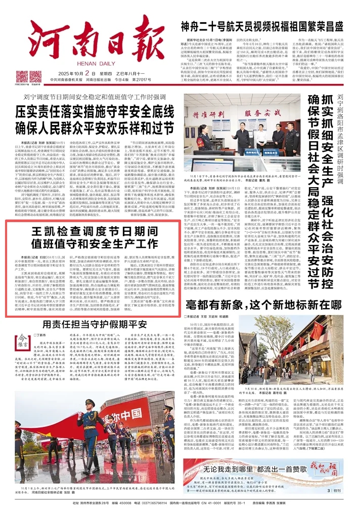 王凱來到省政府總值班室,視頻連線省氣象局、省交通運輸廳、省文化和旅游廳、省自然資源廳、省應(yīng)急管理廳和洛陽市、開封市,詳細(xì)了解假期首日道路交通、文旅服務(wù)、安全生產(chǎn)等情況,向堅守在一線的工作人員致以節(jié)日問候。他說,今年“雙節(jié)”疊加,人流車流量大,各地各部門要深入學(xué)習(xí)貫徹習(xí)近平總書記在河南考察時重要講話精神,樹牢底線思維,強化風(fēng)險意識,嚴(yán)格落實值班值守和信息報送等制度,加強會商研判和協(xié)調(diào)聯(lián)動,用辛勤付出為人民群眾創(chuàng)造平安祥和的節(jié)日環(huán)境。要密切關(guān)注天氣變化,提高氣象預(yù)報預(yù)警精準(zhǔn)度,有效應(yīng)對持續(xù)降雨天氣,切實加強山洪地質(zhì)災(zāi)害防范。要扎實做好交通運輸服務(wù)保障,加強高峰時段、熱點線路運力調(diào)配和管控疏導(dǎo),確保群眾安全便捷出行。要更好激發(fā)文旅市場消費潛能,持續(xù)豐富業(yè)態(tài),提升服務(wù)質(zhì)量,讓廣大游客乘興而來、盡興而歸。要嚴(yán)格落實安全生產(chǎn)責(zé)任制,及時排查消除?;⒌V山、消防等重點領(lǐng)域風(fēng)險隱患,加強商超、景區(qū)等人員密集場所安全監(jiān)管,維護(hù)人民群眾生命財產(chǎn)安全。