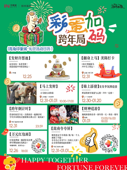 12月31日-1月3日,憑快樂幣可免費(fèi)騎小馬、抽獎、兌換零食禮包,輕松實現(xiàn)童趣與味蕾雙重滿足??缒暌?,商場營業(yè)時間延長至23:00后自然閉店,大屏同步跨年倒計時,和親友一起在歡呼聲中迎接2026,氛圍感直接拉滿!